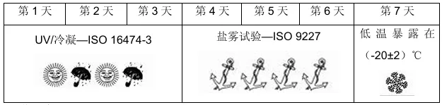 注2:试验模式2循环老化要求见下图(一个循环:包含3天UV,3天中性盐雾和1天低温暴露)